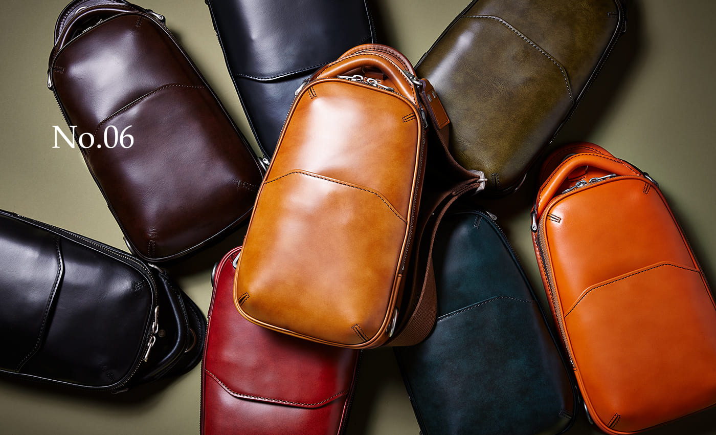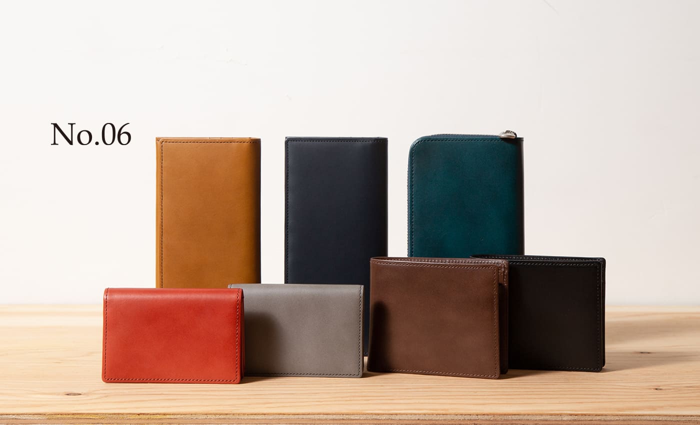 クラッシックライン-No.06に使う「ワキシングレザー」をはじめ、姫路のタンナーと共同開発したオリジナルレザーも用意しています。