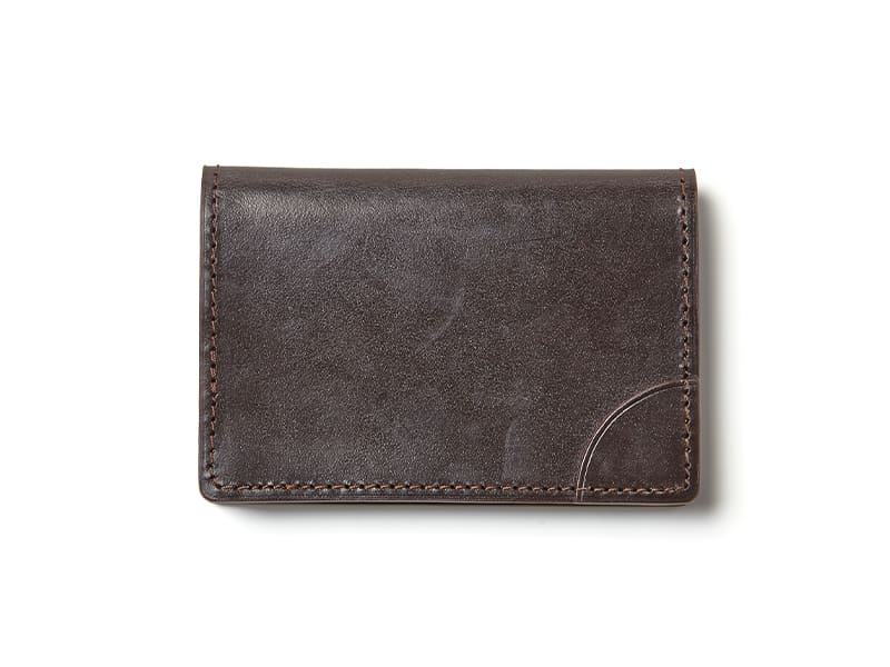 英国製ブライドルレザーの名刺入れ。ブライドルレザーならではの品格が漂い、初対面の相手に印象を残します。約40枚の収納が可能で、仕分け機能も充実。内装はブラウンの国産ヌメ革を使ったコンビ仕様。愛用していくにつれ、表面についた蝋が馴染み経年変化が楽しめます。