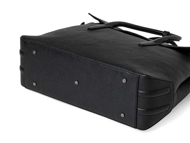 バッグの自立性を高め、型崩れを防ぐために底面にはしっかりと底鋲を配置。これにより、床やテーブルに置いた際の安定感が増し、バッグの美しいフォルムを長く保つことができます。使い込むほどに、その違いを実感できるディテールです。