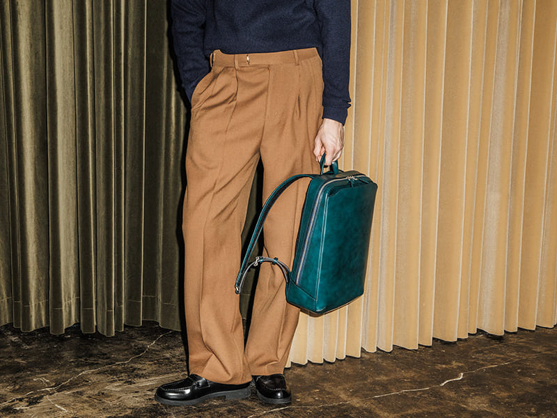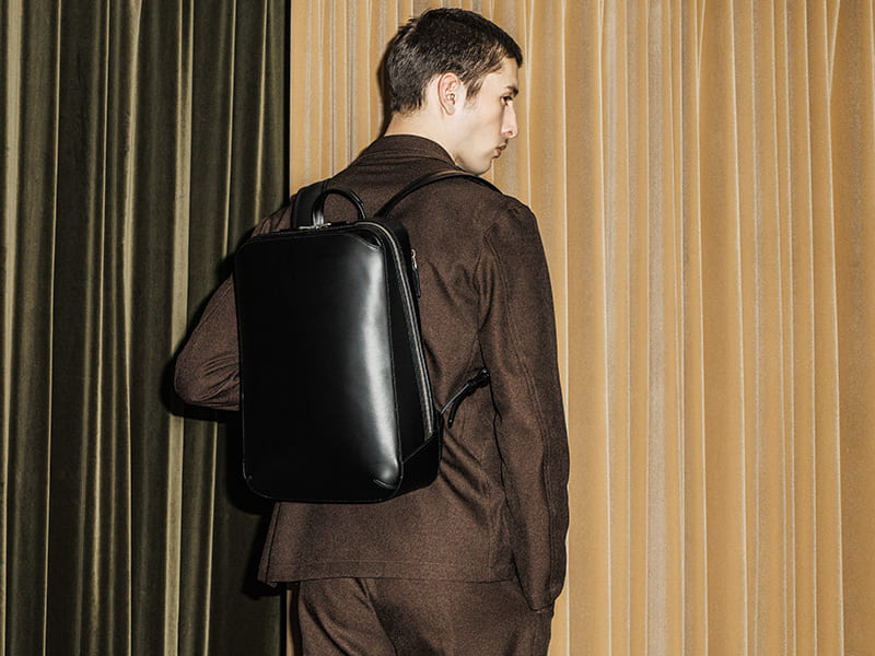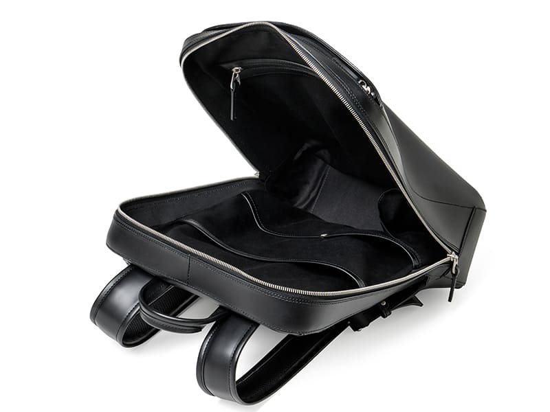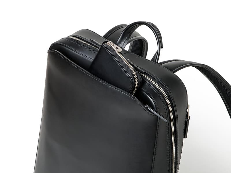 No.06ワキシングレザーのバックパック。正面は装飾を排した1枚革仕様で、革の質感、高級感を存分に感じていただけます。背面には、13インチ対応PCルームを実装、さらに快適な背負い心地を実現するメッシュ仕様でアクティブな使用にも対応。内外装に複数のポケットを備えた、ビジネスシーンに最適な機能性を備えたバックパックです。