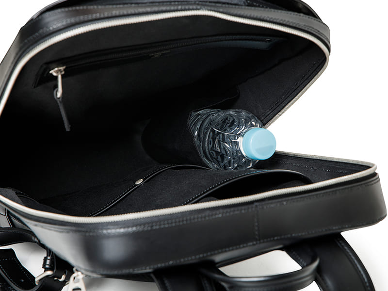 内装にペットボトルホルダーを搭載。バッグの中で転がりやすいボトルをしっかり固定し、荷室の整理整頓をサポートします。持ち運びの際も中身が安定し、快適にお使いいただけます。