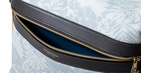 ゴルフボールがボックスごと入る大きめのフロンポケット。機能面のみならず配色になったレザートリム、ゴールドファスナーが印象的、このバッグを際立たせるデザインポイントです。