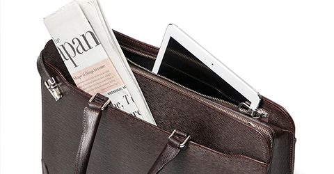 特徴的な型押しを施したオイルドレザーのブリーフケース。エレガントで重厚感あるフォルムはしっかりと芯材を入れているため型崩れしにくく、凛とした佇まいをキープします。あおりポケットやL字に開く開口部で使い勝手にも考慮しました。