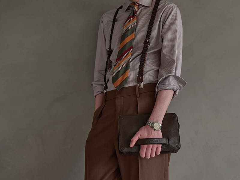 No.06(ワキシングレザー)から型押し素材がラインナップ。こちらは2wayタイプのクラッチショルダーバッグ。3つに仕切られた荷室は、それぞれにマチを設け見た目以上の容量を誇ります。8枚入るカードポケットやファスナーポケットも備えた機能性をコンパクトなボディに集約。休日の荷物をスタイリッシュに持ち運べます。