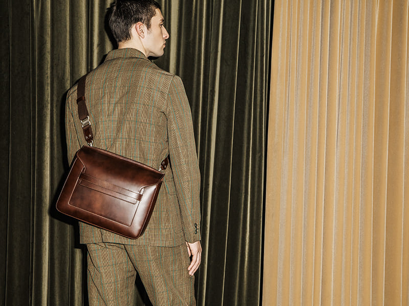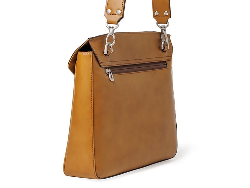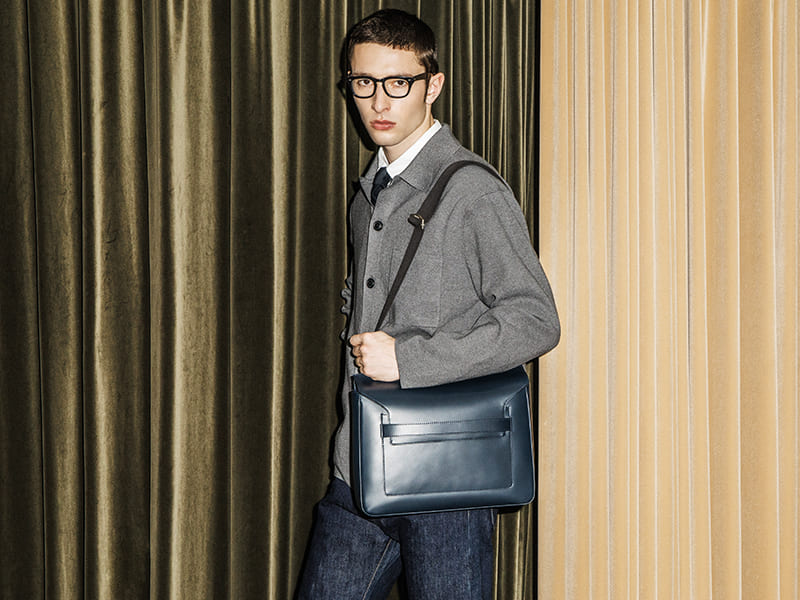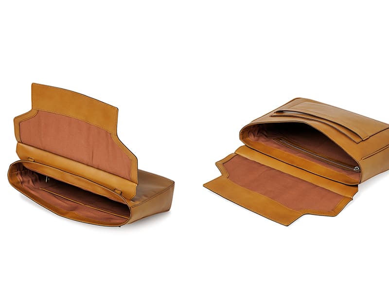 広めに設けた底マチから上部にかけてテーパードさせることで、バッグのデッドスペースを排除しつつ、スマートなシルエットを実現。A4サイズ対応の収納力を備えながらも、身体にしっくりと馴染むバランスの取れたフォルムです。