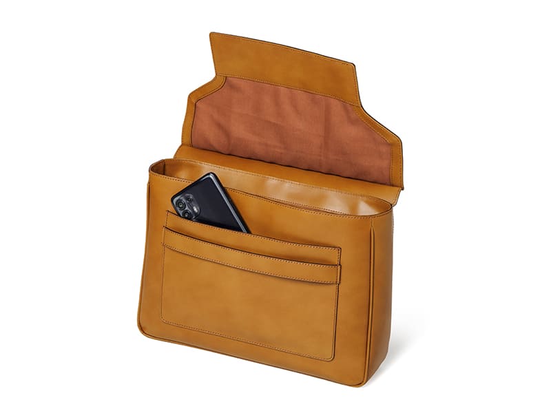フラップ下には、見た目を損なわずにセキュリティ性を高めたポケットを配置。スマートフォンやパスケースなど、すぐに取り出したい小物の収納に最適です。背面ポケットと合わせ、メイン収納としっかり仕分けが可能。利便性と安心感を兼ね備えた、日常使いにうれしい設計です。