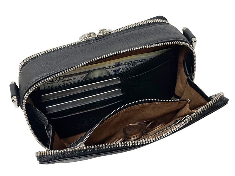 片側の荷室には、カードスリットやファスナーポケットを備えており、カードやコイン、紙幣はもちろん、ちょっとした小物までスマートに収納可能。コンパクトながらも財布としての機能性をしっかりと兼ね備え、スタイリッシュに持ち歩けます。