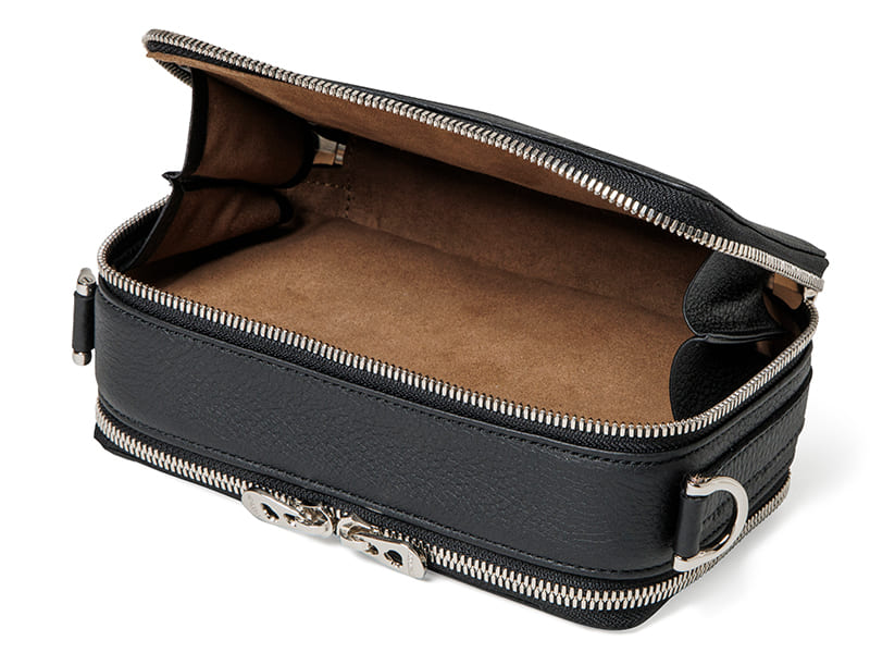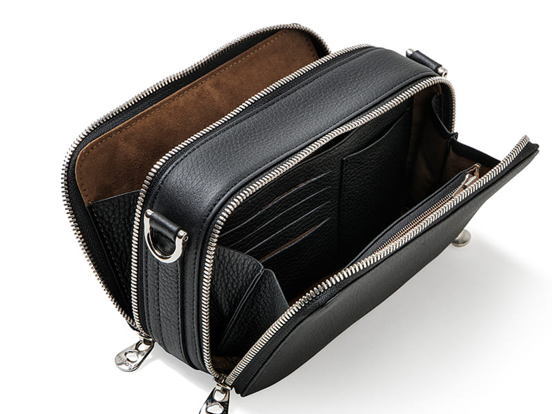 もう一方の荷室は、自由に使えるシンプルなフリースペース。スマートフォンやパスポート、小物などをサッと出し入れできる無駄を省いたスマートな設計です。裏地には、起毛生地を採用し、手に触れるたびに心地よい感触を楽しめます。