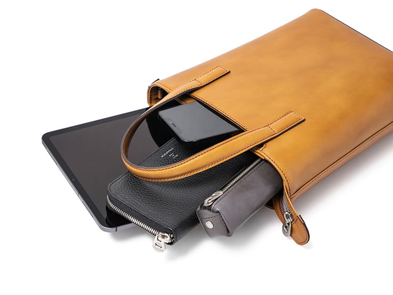 外装のポケットはスマートフォンを入れるのにぴったり。メインルームもタブレット、長財布など休日の外出をしっかりカバーする収納力です。