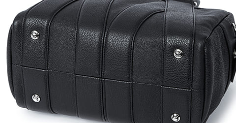 フロントのデザインになっているベルトは底面から上部に引き上げることで荷重に対するバッグの強度を高めます。また、直置きした時の痛みを軽減する底鋲も完備します。