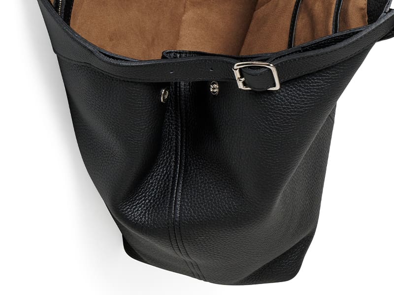 両サイドのベルトとスナップボタンで、荷物の量に合わせてスマートに容量調整が可能。そのシルエットの変化も美しく、異なる表情を楽しめます。日常使いはもちろん、出張や旅行、レジャーまで、あらゆるシーンで活躍します。