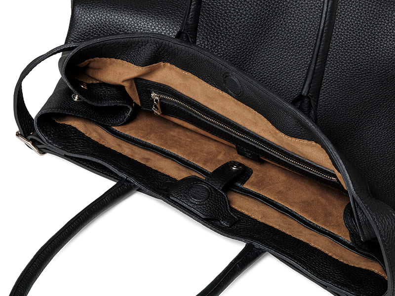 荷室内には、ファスナータイプとオープンタイプのポケットをバランスよく配置し、シンプルながらも使いやすい仕様です。裏地には、起毛生地を採用し、手に触れるたびに心地よい感触を楽しめます。