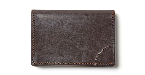 英国製ブライドルレザーの名刺入れ。ブライドルレザーならではの品格が漂い、初対面の相手に印象を残します。約40枚の収納が可能で、仕分け機能も充実。内装はブラウンの国産ヌメ革を使ったコンビ仕様。愛用していくにつれ、表面についた蝋が馴染み経年変化が楽しめます。
