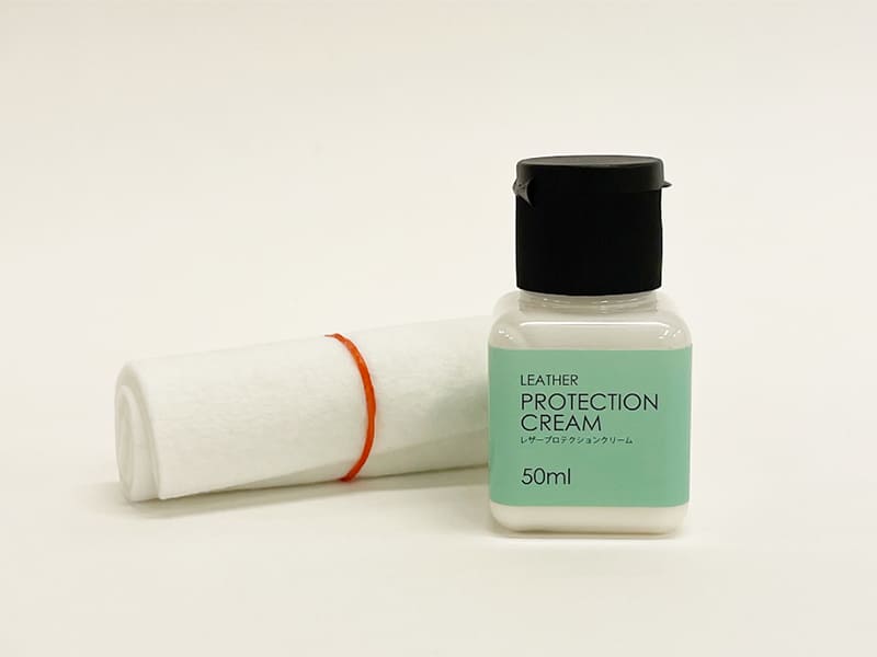 プロテクションクリームは革に必要な水分、油分を革内部に浸透させ風合いを維持する【保湿】と、撥水、撥油効果、汚れの革内部への浸透を防ぐ【保革】を同時に行うプロダクトです。特に人の汗、皮脂の浸透が原因で起こる「ひび割れ」はあらかじめプロテクトしておくことで予防でき、製品寿命がぐっと伸びます。