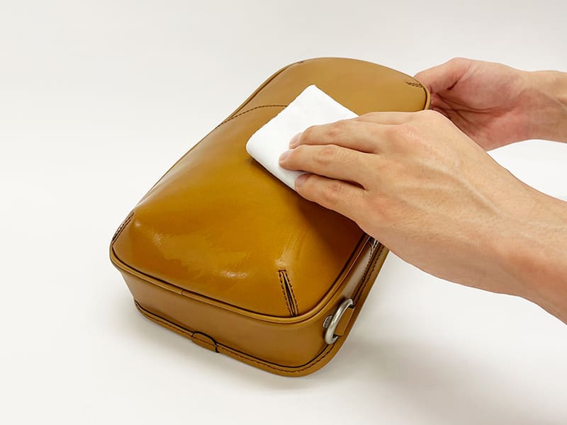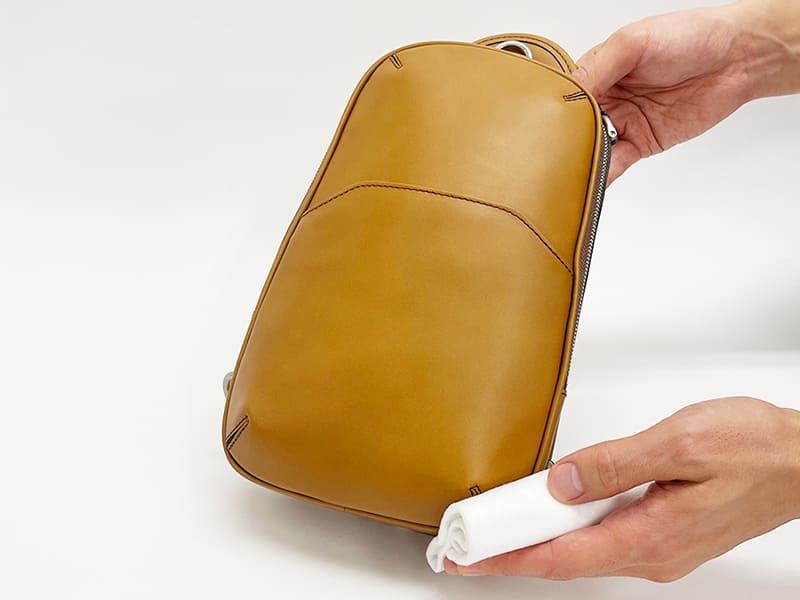 洗い終えたら柔らかな乾いた布で拭き取ります。洗浄後は水に濡れたような色になりますが30-40分ほど乾燥させれば元に戻りますのでご安心ください。ドライヤーなどの熱源は使用せず自然乾燥させてください。洗浄後はプロテクションクリームの効果がリセットされますので、乾燥したことを確認したら、またプロテクションクリームを塗ってください。