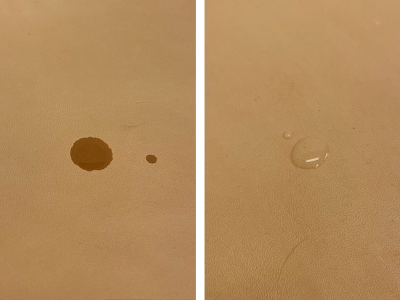 プロテクターの使用有無による耐水性の比較です。デリケートなヌメ革で実証テストを行なっています。プロテクターを使用した右側は表面に水滴としてとどまり、内部に浸透していないことがわかります。ですが、長時間の放置は厳禁。油も水分も極力すぐに拭き取るようにしてください。