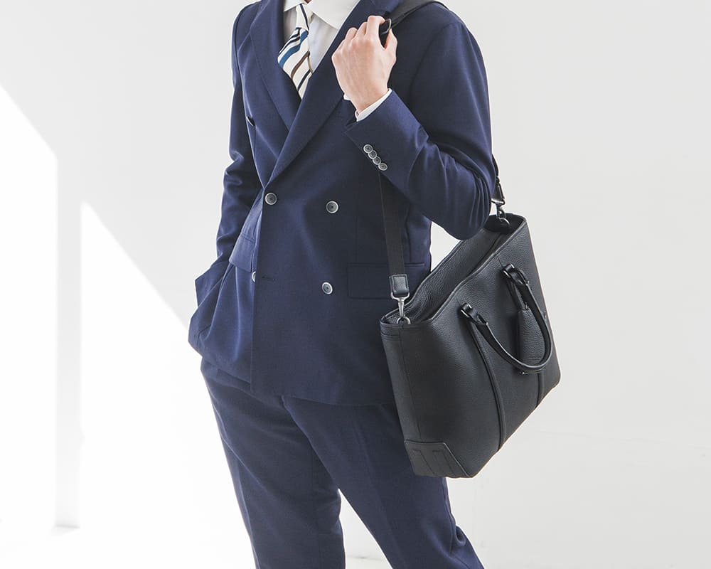 ビジネスバッグといえば正統派ブリーフケースも素敵ですが、ワークスタイルの幅が拡がった昨今はビジネストートもおすすめ。オンオフ兼用のトートバッグの上をいく機能性を有する「ビジネスシーンに特化したトートバッグ」です。ブリーフケースのように使え、仕事終わりの少しくだけた場面にも対応できるのでウィークデーのマストアイテムになるでしょう。