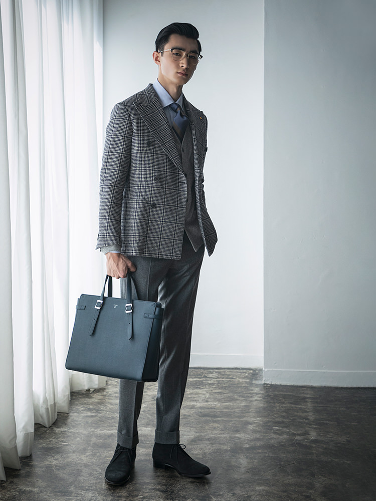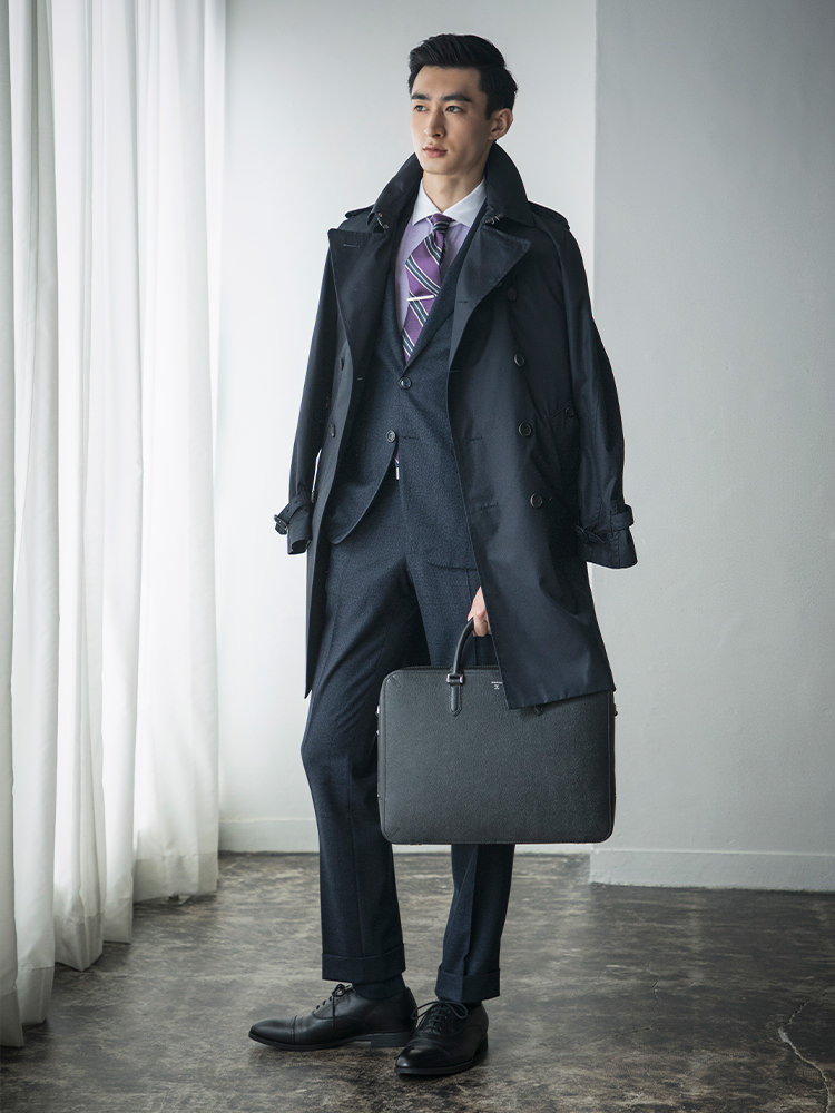 優美なスーツスタイルにはスタイリングに溶け込むミニマルデザインのブリーフケースを携える。シンプルな面持ちでありながら荷室を二つ設け、ビジネスシーンをしっかりサポートします。