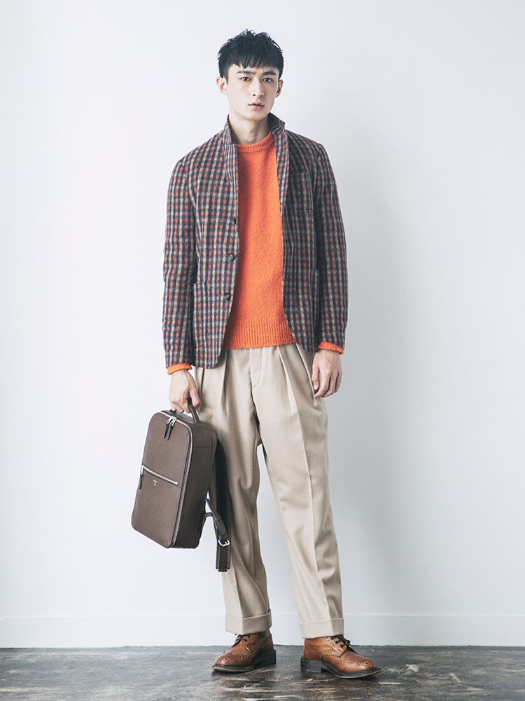 起毛感のある素材を用い暖色でまとめあげた秋冬らしいスタイリングに、同系色のブラウンのバックパックを持つ。柔和な印象の中で垣間見えるスクエアフォルムの存在感がスタイリングを引き締めます。