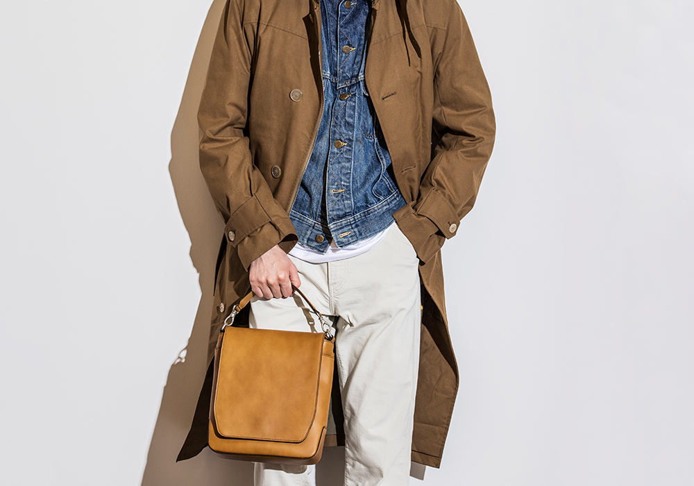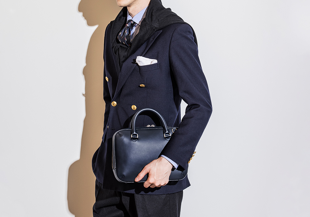 正統派ブリーフケースの構築をミニサイズに落とし込んだ遊びの効いたバッグ。クラッチスタイルや、付属のベルトでショルダースタイルでも。ジャケットにはもちろん、カジュアルスタイルに合わせればスタイルを引き締めてくれます。