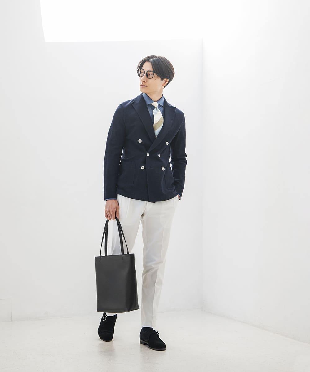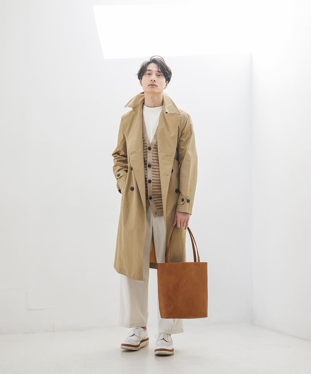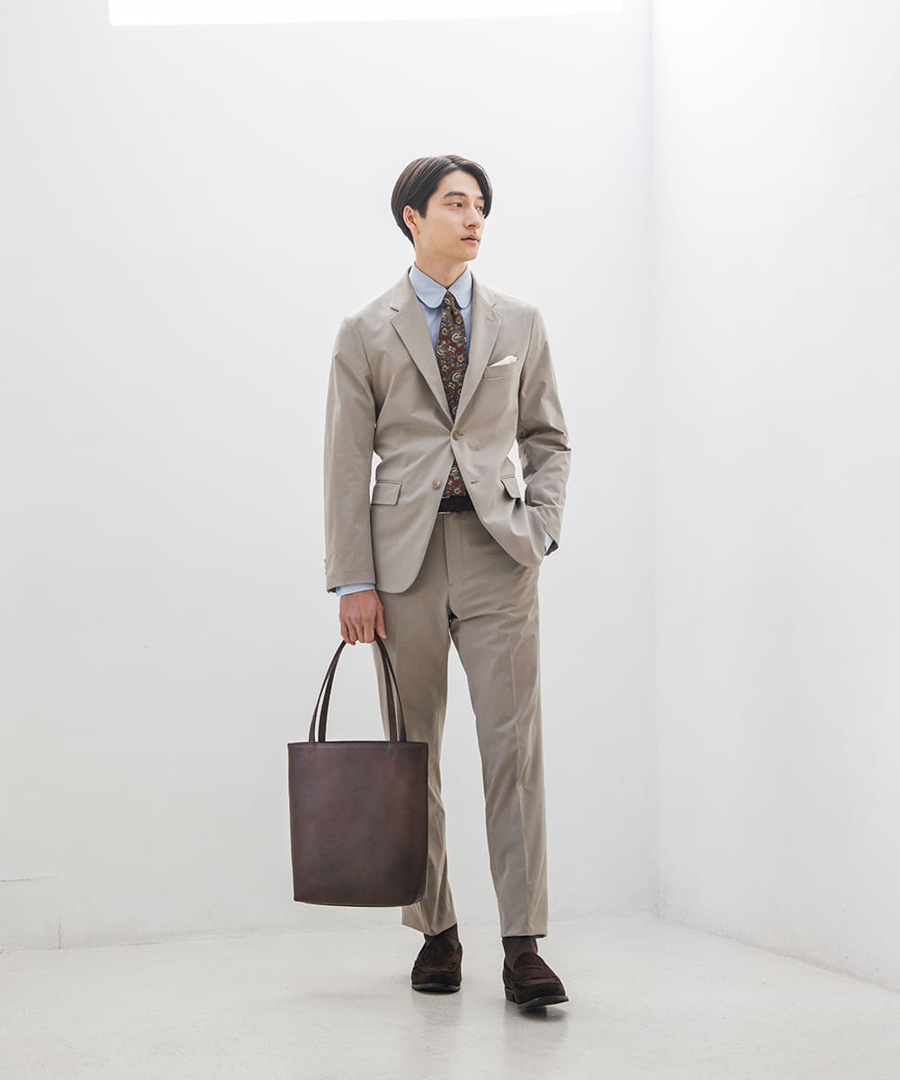 カジュアルスタイルならキレイ目に、ジャケットスタイルならかしこまりすぎない絶妙なバランスに仕上がります。トートバッグならではのラフさは残しつつ、スタイリングにおける汎用性は縦型ならでは。