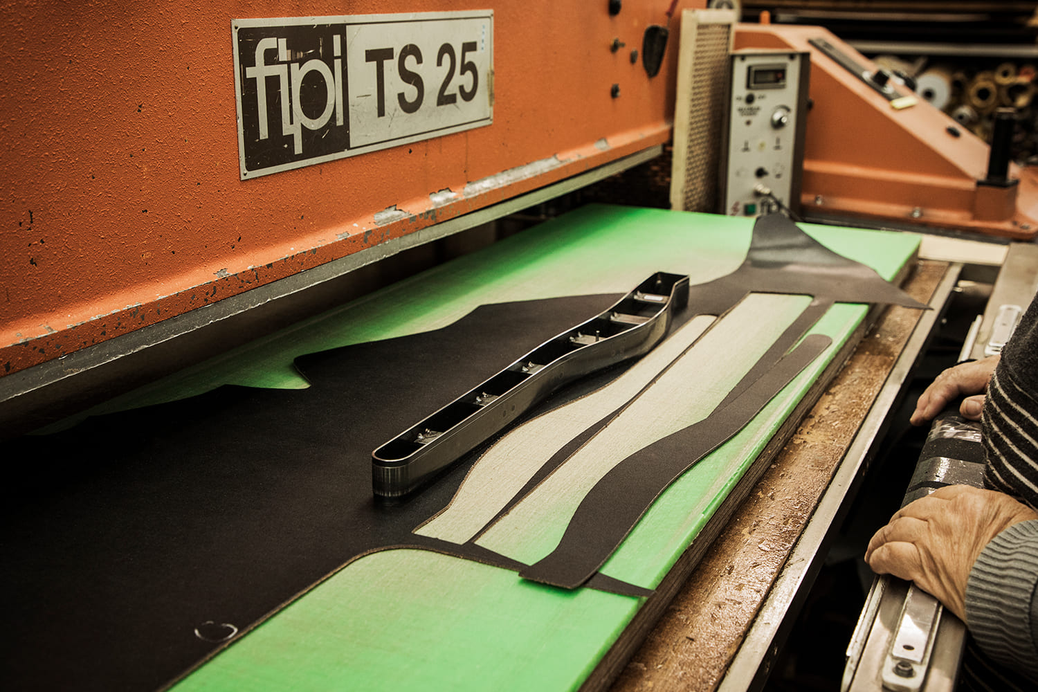 ハンドルの根革など特に強度が求められるパーツには、芯材を入れたり2枚の革を貼り合わせたりする二次加工を施します。エルゴポックの根革は表面に使う素材2枚を、銀面を外側にして貼り合わせる贅沢な仕様。このように外からはほとんど見えない部分にも手抜かりのない仕事を行うところが、日本のものづくりの信頼性を支えているのです。