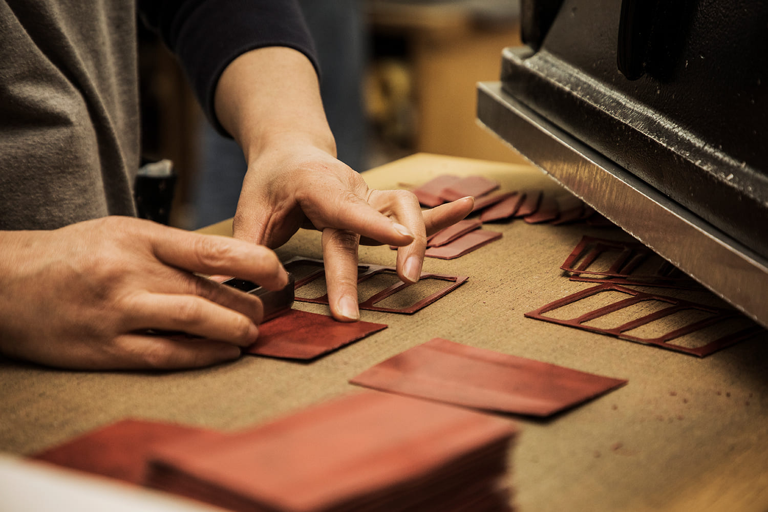 型入れのマークに合わせ金属製の歯型を置き、プレス機でパーツを抜きます。小さなパーツは手作業で丁寧に裁断していきます。通常、ここまでの作業を済ませたパーツが工場に届き、そこから縫製作業を開始する例も多いなか、エルゴポックはすべての作業をこの工場内で行います。