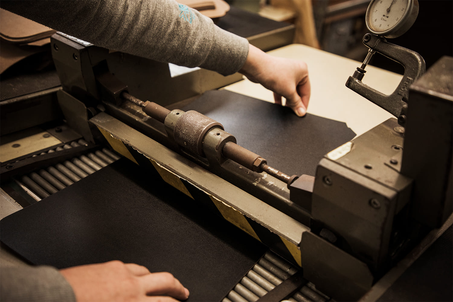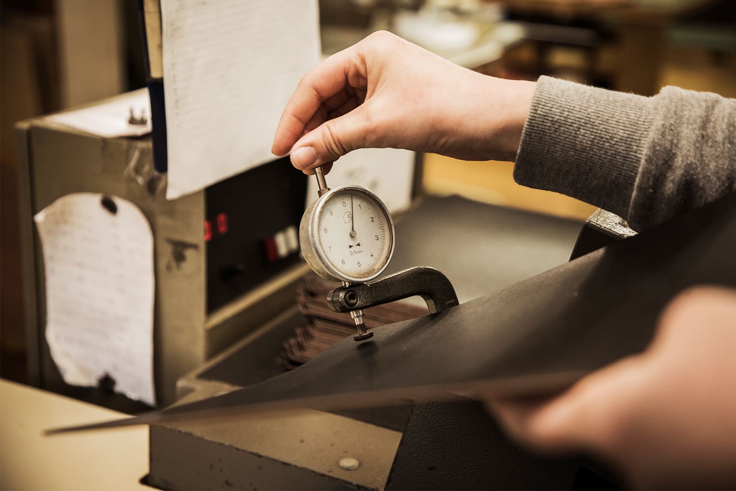 裁断したパーツを専用の機械に一枚ずつ通し、革の厚みを均一に整えます。機械を通した後、任意の箇所をゲージで計り規定の厚さになっているかをしっかりチェック。各パートの作業は責任をもって確実に遂行され、次の工程へと引き継がれます。
