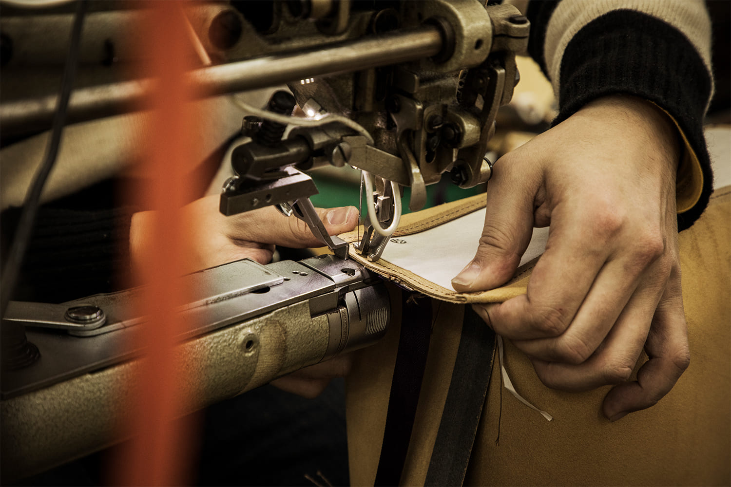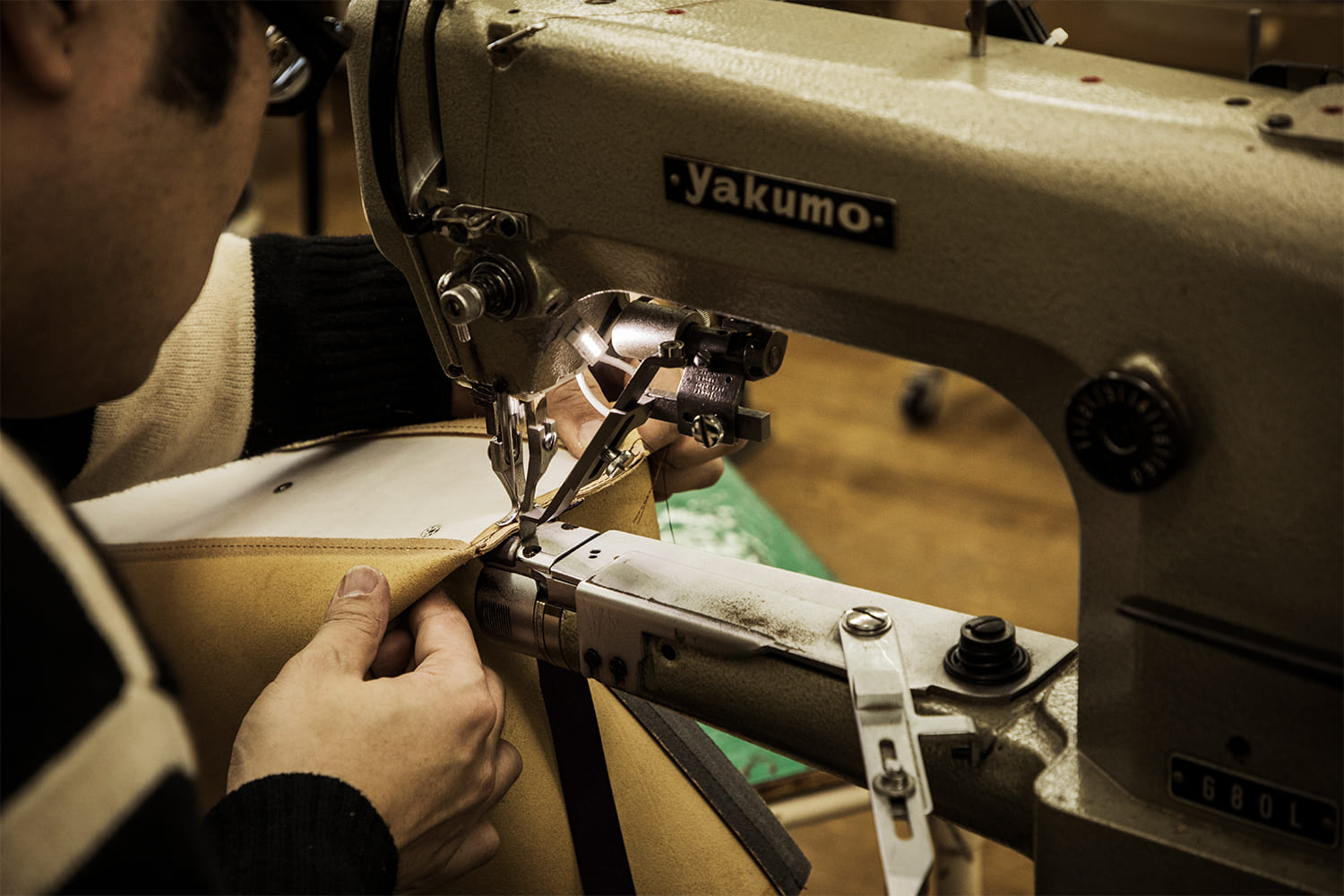 ブリーフケースなど形状のカチッとしたバッグは縫い目が外に出る外縫いで仕上げます。使用するミシンは、ポストミシンと呼ばれる台座のない特殊なもの。このミシンならカーブを描く角の部分もしっかりと縫うことができるのです。