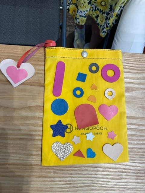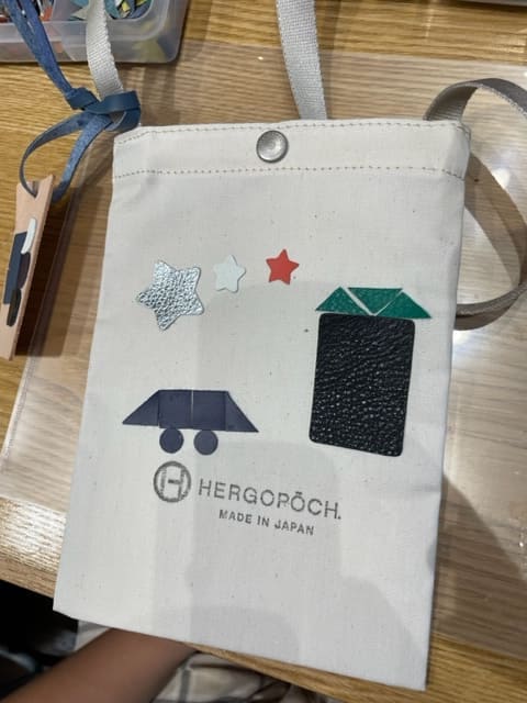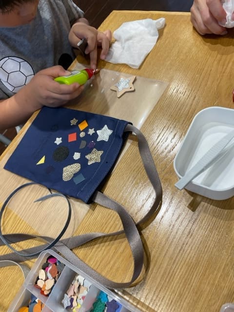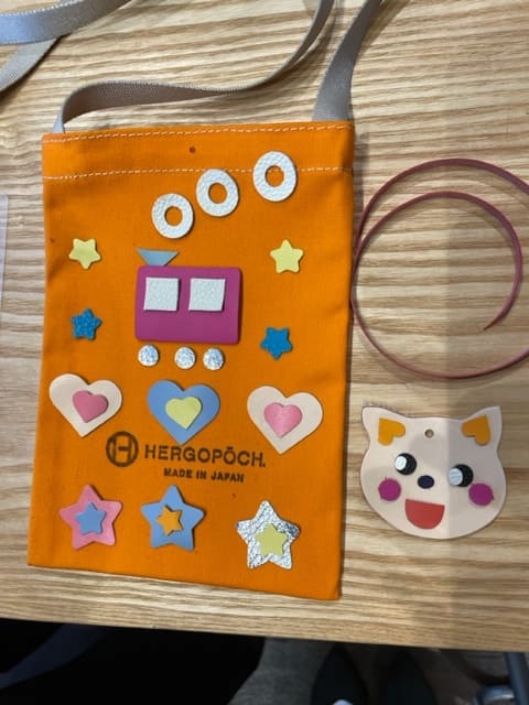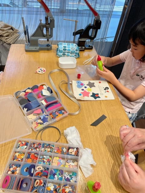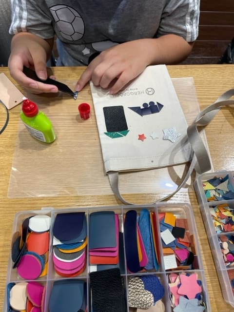 このワークショップは、あらかじめ裁断された革パーツを使って、ボンドでバッグにデコレーションを行うものでした。子供たちや親御さんたちは、自分の好みやアイデアに合わせてパーツを選び、独自のデザインを作成しました。その手軽な作業にも関わらず、参加者たちの創造性が光りました。