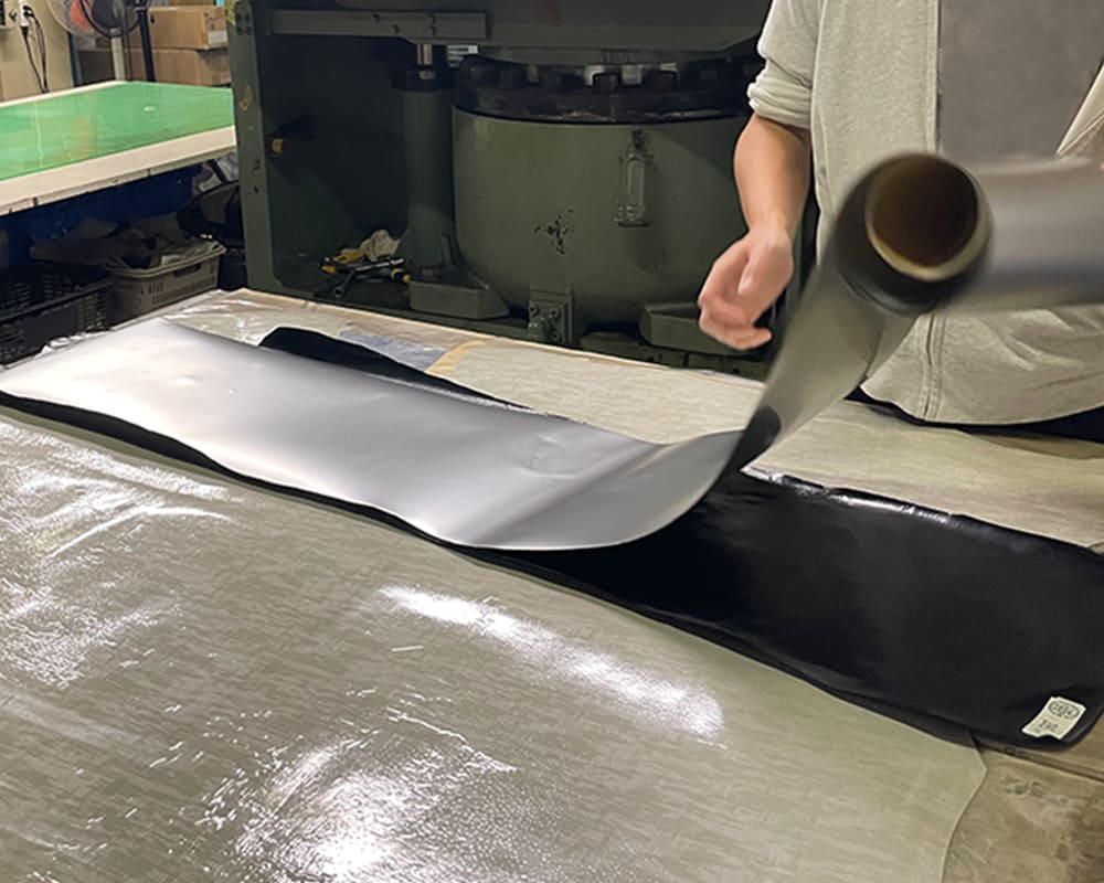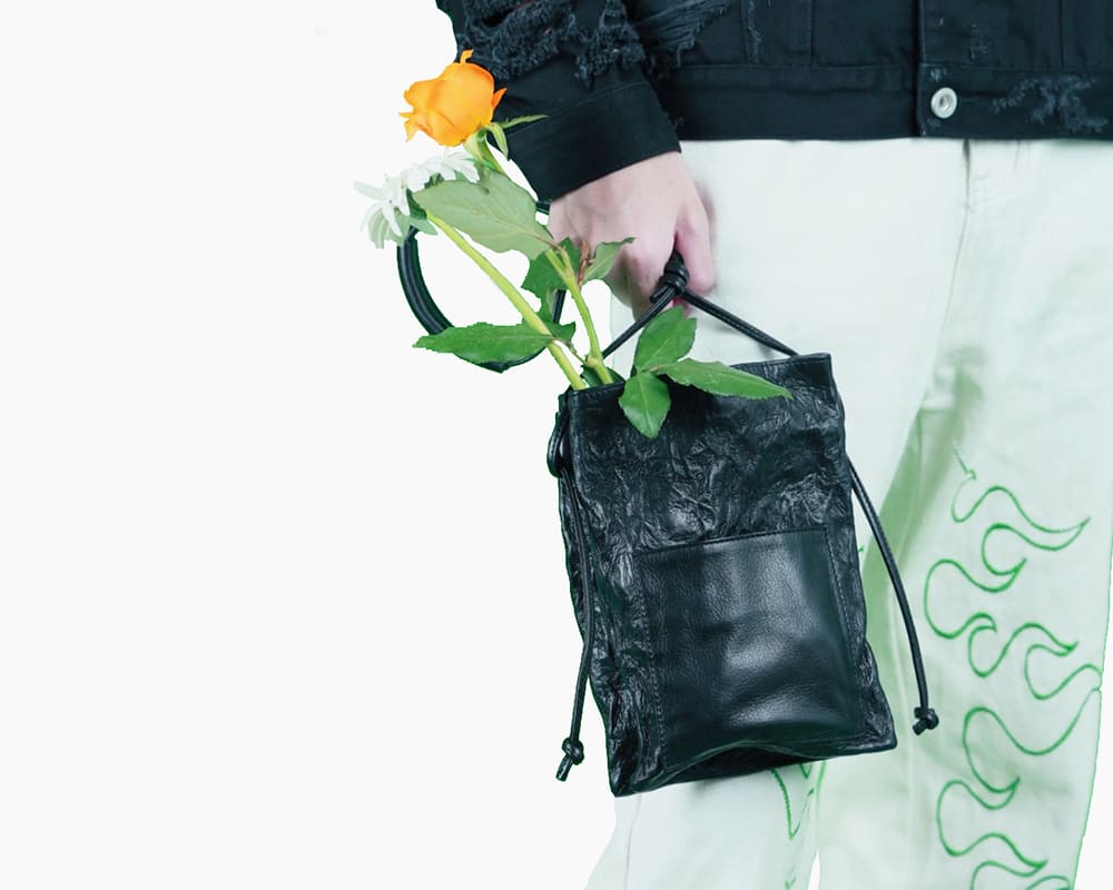 ファッション学生の自由な発想はデザインはもちろん、このプロジェクトの中枢であるレザーによく現れています。それはレザーに異素材の「アルミ」をボンディングしたハイブリッド素材の採用。ボンディングすることでレザーのキズやシミが馴染み、アルミの形状記憶性によりテクスチャー感ある素材が出来上がりました。