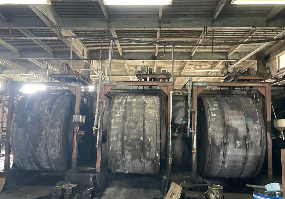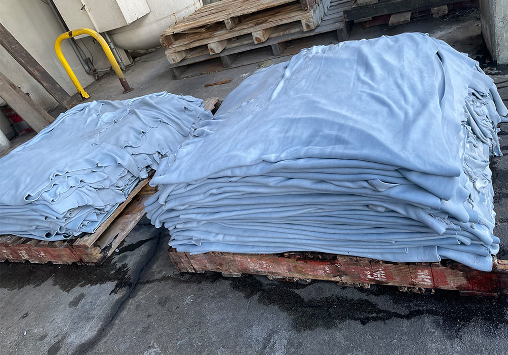 この大きなドラムで鞣しや染色といった各処理を行います。ワキシングレザーはクロムとタンニンの混合鞣しとしています。まずはクロムで鞣します。クロム鞣しを施すとウェットブルーと呼ばれる青白い状態で上がってきます。その後、最低量を残しクロムを取り除き、タンニンで再度鞣します。この鞣しを経て皮→革に変貌を遂げます。