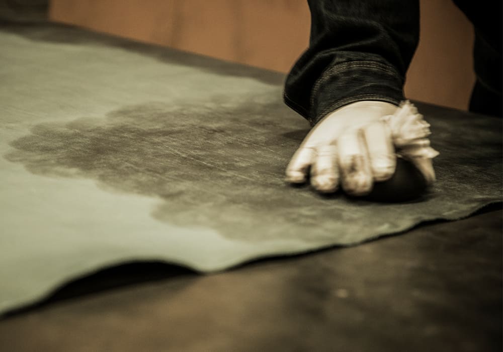 下染めやオイルを入れたり必要な処理を施した後、ワキシングレザーならではのアンティーク加工の工程に入ります。ベースカラーの上にさらに濃色を載せていくこの作業ですが、実は手作業でおこなわれており同じ個体は存在しません。