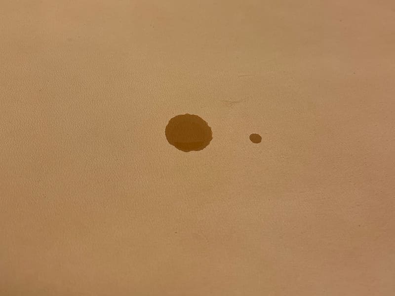 ヌメ革や染料染めの革は、革の風合いを活かした一方、表面が保護されていないため、水に濡れるとシミ、移染が起こりやすいです。