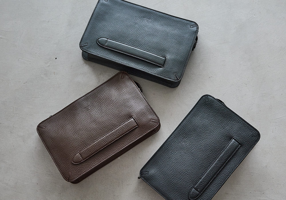 エルゴポックの人気モデルの一つ2wayクラッチバッグに新素材が追加されました。新たに採用したレザーは自然なシボの型押しを施したHM-エンボスレザー。上品なシボと落ち着いた色味で大人な男性にぴったりです。