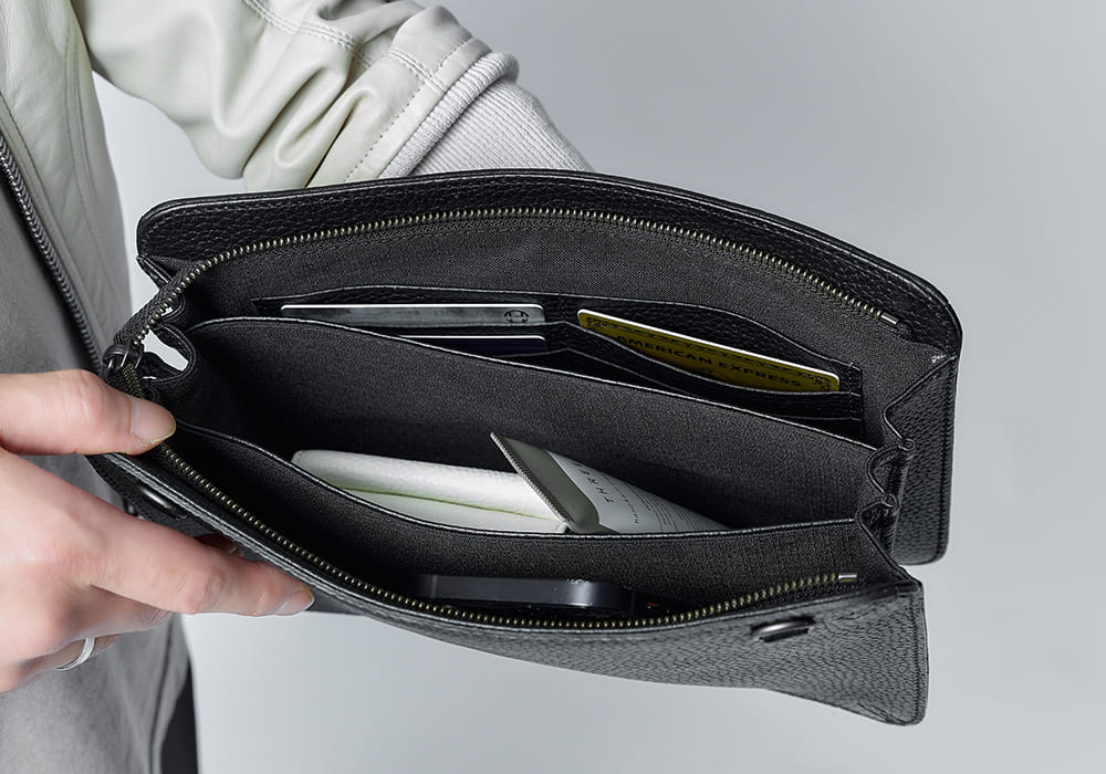このバッグの特徴は内装。3つに仕切られ、カードスリットも備えた使い勝手の良さをコンパクトなボディにまとめています。これなら支払いもスマートにしていただけます。