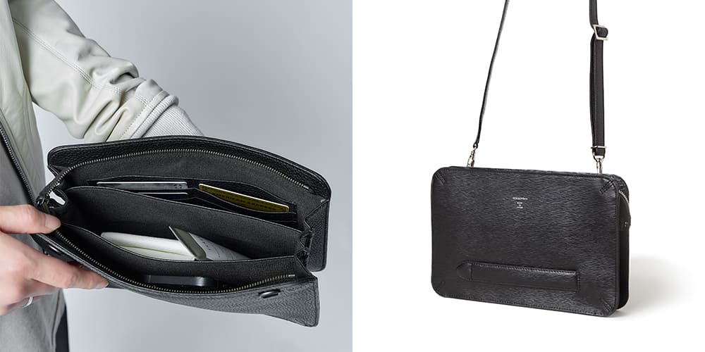 内装は3つに仕切られるので使い勝手が抜群に良く、カードスリットもありウォレットバッグとしてお使いいただけます。