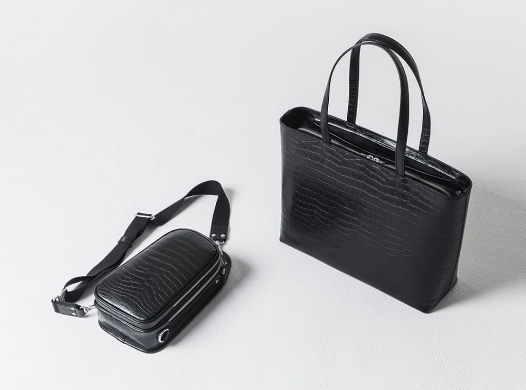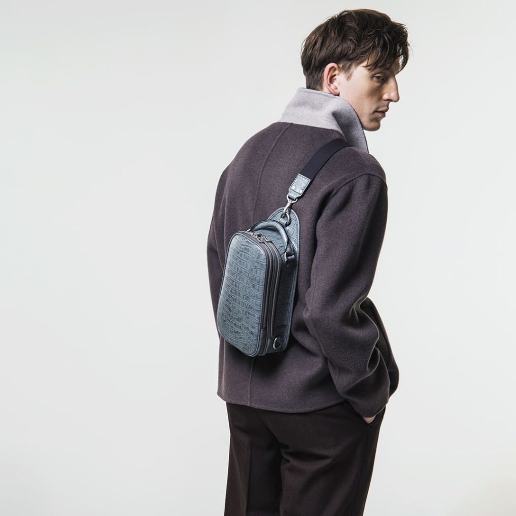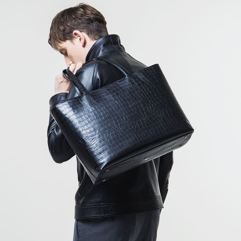 オリジナルのワキシングレザーにクロコ型押しを施し、さらに濃色の重ね塗りと熱処理で仕上げた、唯一無二の深みある表情。
